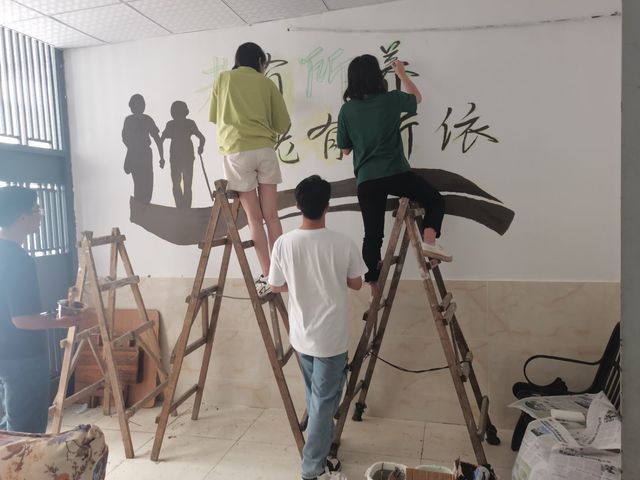 活动中,墙体绘制。在墙绘活动中协会成员尽职尽责,分工合作,相互配合,分别进行打形,上色,勾线,描边等程序。在每天的墙绘工作开始前,协会同学会在墙下铺一层废旧的报纸,以防止地面被颜料弄脏。同时,在每天墙绘工作结束后,协会同学也积极清理工作场地,保持社区环境干净整洁,在美化社区的同时不留下任何的人为污染。在此期间协会成员也积极与社区居民进行沟通交流,社区居民对此次社区环境改造表示深深的喜欢和强烈的支持,积极配合协会成员的工作并为协会成员提供休息的地方,社区居民委员会也经常在工作期间慰问协会成员并送水表示关心,为我们提供必要的工具等等。就这样在协会成员、社区居民和社区居民委员会三方的共同努力下,此次墙体彩绘工作按质按量按时圆满完成,墙绘作品色彩丰富、内容鲜活,风格多样,此次活动让原本的老旧社区焕然一新,成为了倡导文明,树立新风的宣传阵地。