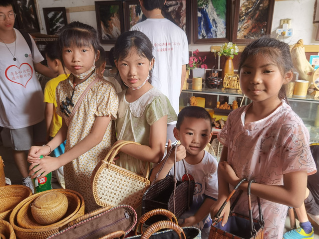 2022年6月25日早上,亦是美好的的一天,志愿者们早早来到指定地点集合,统计参加活动的人数和让孩童们登记自己的名字,方便志愿者的管理。出发点西来九年制学校,去往当地镇上小巷体验传统古镇文化。志愿者们带着孩童们穿过具有厚重文化的巷街,里面倒挂着的彩灯以及数不胜数的油纸伞,构成的是一幅幅美丽画卷,让孩童们沉迷于其中。汲取古镇文化的路上,孩子们踏着青石板,为志愿者们讲解他们家乡最具特色的关公小塔。孩童们说“这个塔在他们出生时就有了,里面的那位就是关公…“。听着他们细心的解说,志愿者们耐心的听着并向孩童们询问着周围富有古老气息的建筑。走着走着,大家在一处非物质文化遗产—竹编处停下了脚步。竹编教授人看着志愿者们带着孩童们探寻古镇文化,热情邀请大家来体验竹编文化,在孩童们体验竹编的过程中,竹编教授人讲解每一个竹编的制作过程,以及为孩童们一一介绍每一件作品所要用到的材料,涂料和制作时长。孩童们伴随着教授人的讲解和此刻欣赏体验竹编的内心,已经深深的陷入其中。不仅仅是孩童们体验到了竹编文化源远流长,志愿者们也是迟迟不愿离开这片圣地。在孩童们欣赏之时,志愿者们邀请教授人现场进行竹编编制,这精湛的手法让大家十分震撼,使得对竹编文化有了更多的向往。